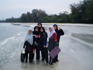 Seawal jam 6.30pagi usai solat subuh, saya serta beberapa orang teman keluar ke pantai. Hajatnya untuk melihat matahari terbit. Tetapi johor di selatan. Bukannya kawasan yang sesuai untuk melihat kecantikan matahari terbit mahupun terbenam jika hendak dibandingkan dengan kawasan pantai barat dan pantai timur. Saat kami melangkah keluar dari chalet, beberapa orang kawan-kawan lelaki telah pun terlebih dahulu bersantai di tepi pantai. Menikmati embun pagi di tepi pantai.=P.